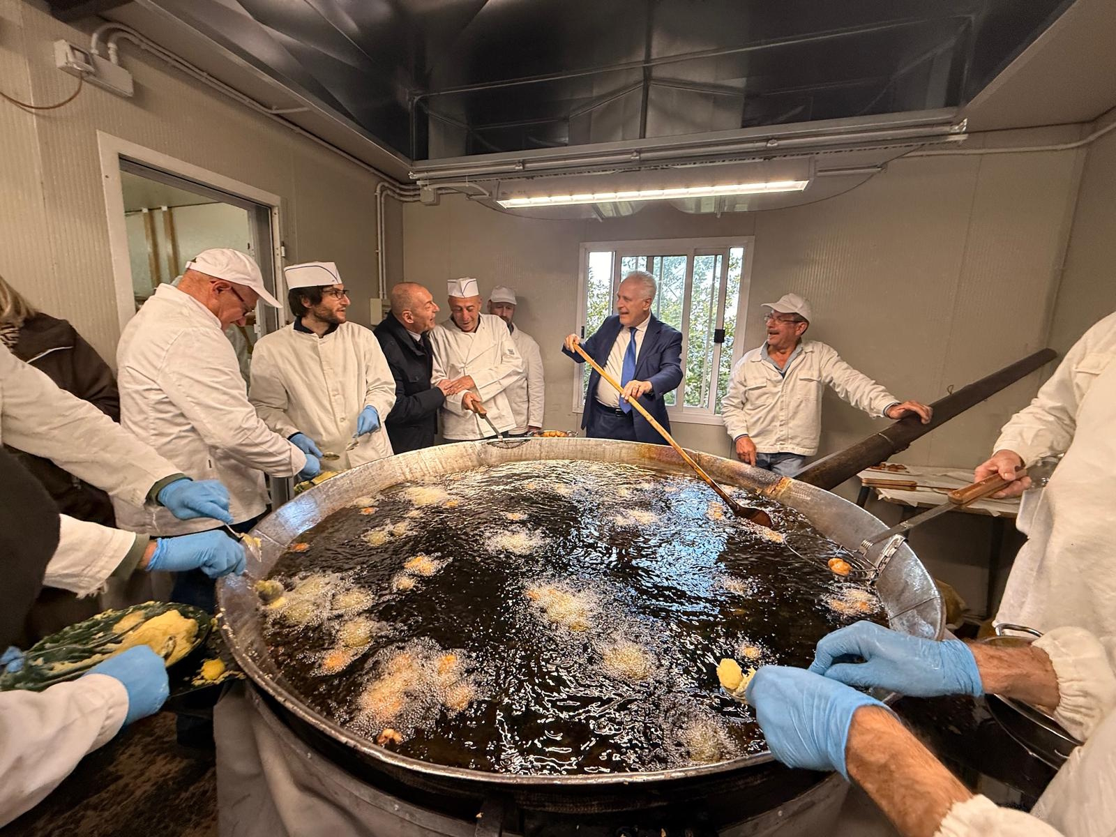 Tanti sorrisi e travolgente energia tra i volontari, custodi di ricette e segreti culinari, che intorno alla maxi padella del diametro di due metri, nei locali allestiti in piazza, hanno dato vita al grande spettacolo della preparazione delle soffici frittelle, impastando, friggendo, tuffando nell’olio di arachidi le palline di riso, realizzate con il latte, lo zucchero, la scorza di arancia e vin santo, e prelevandole con le schiumarole e i cestelli.