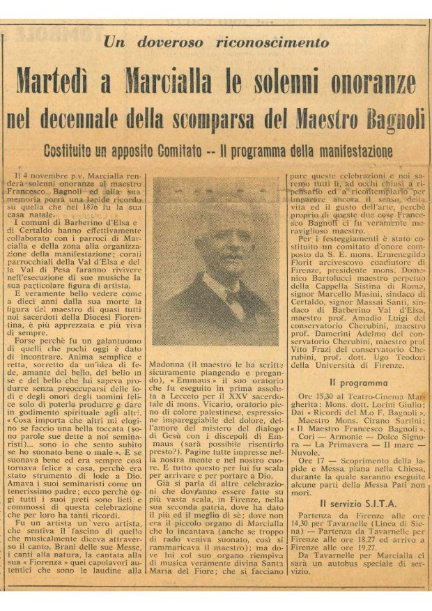 Il Comune di Barberino Tavarnelle prosegue il suo inedito percorso di riscoperta e valorizzazione della figura di Francesco Bagnoli (Marcialla 1876 - Firenze 1947) con un nuovo appuntamento culturale che ‘riporta’ il talento dell’organista chiantigiano, celebre per le sue composizioni di musica sacra e il ruolo ricoperto nella prima metà del secolo scorso di maestro di Cappella dell'Opera di Santa Maria del Fiore, nella città dove si formò e operò per tanti anni: Firenze.
